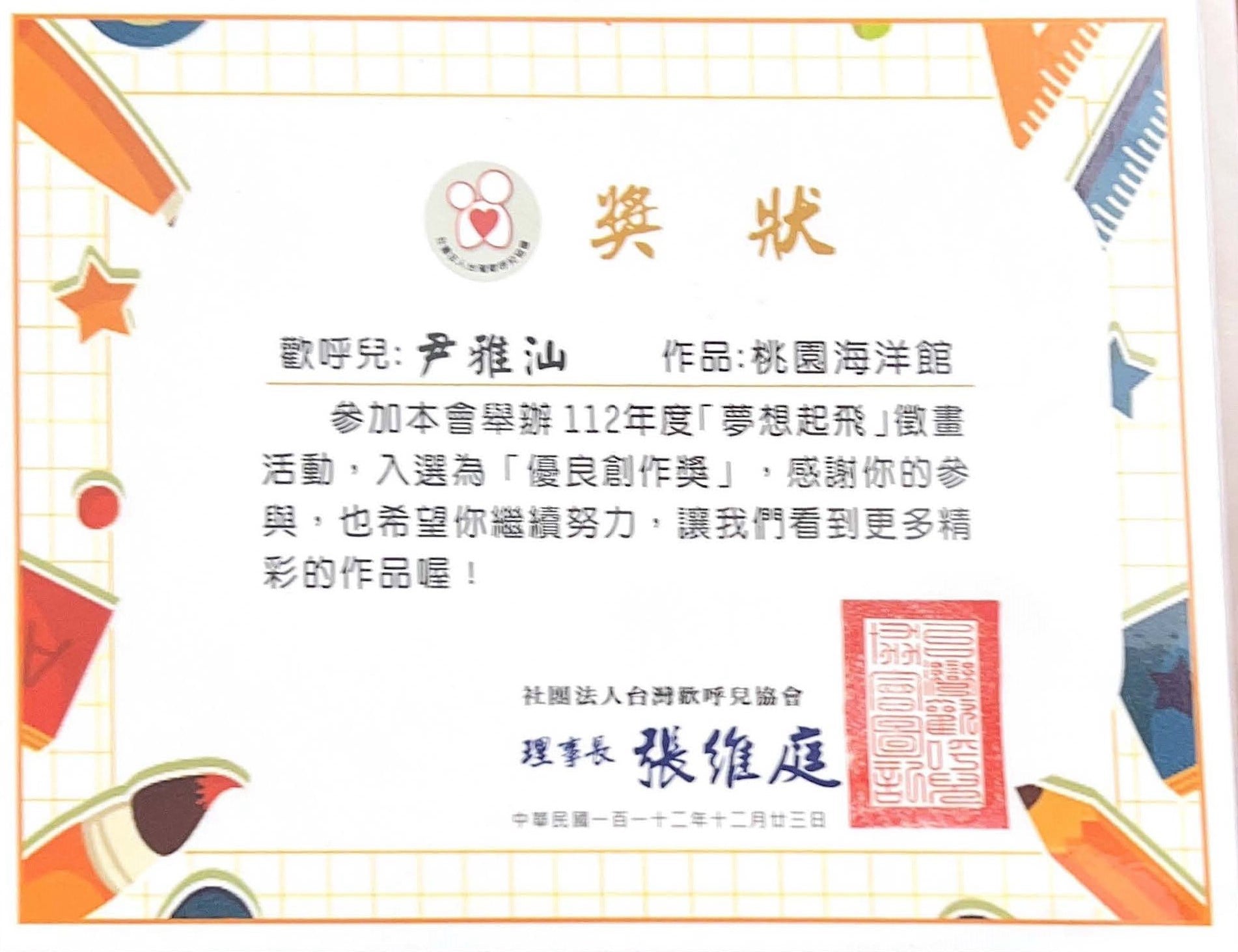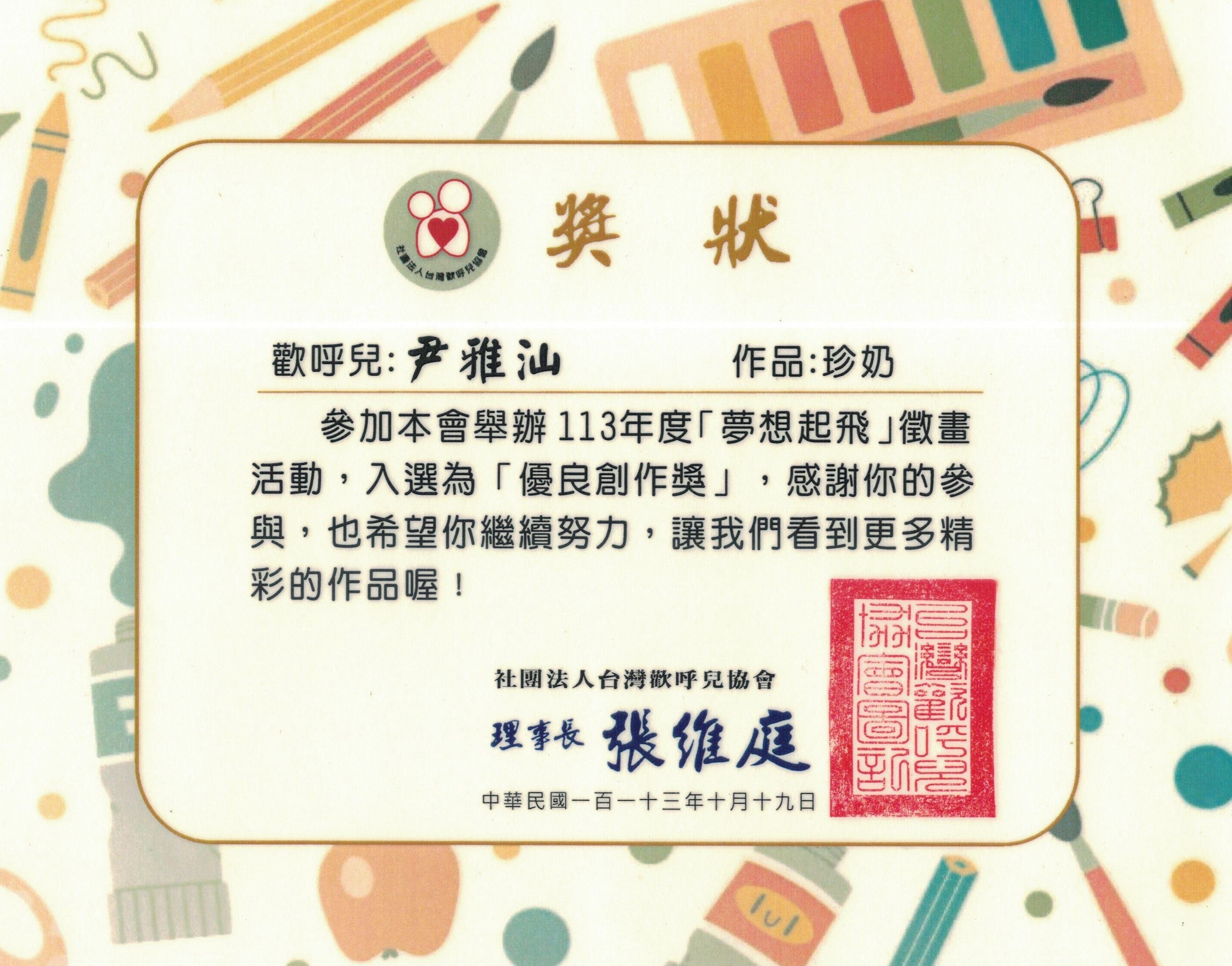 但我沒有放棄。努力活下來的我,現在已經順利從國小畢業。我在音樂與美術中找到熱情與力量,也很感謝學校給我參與比賽的機會,感謝評審對我作品的肯定。尤其在獲得2025年總統教育獎之後,我更有勇氣堅持夢想、走出屬於自己的一條路。