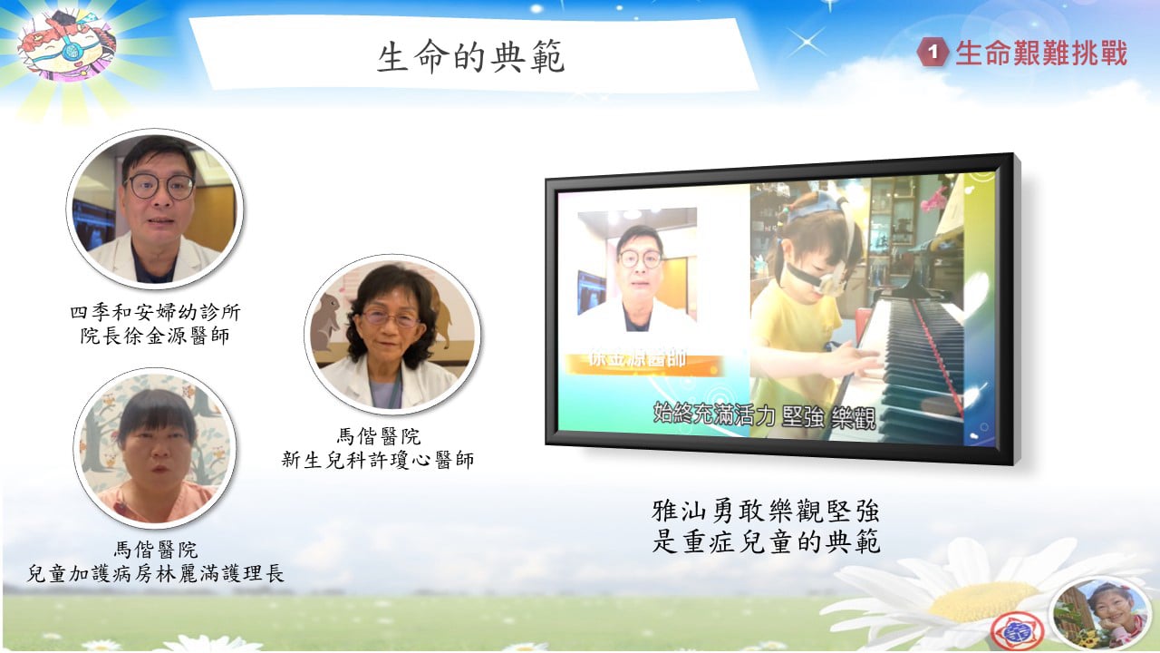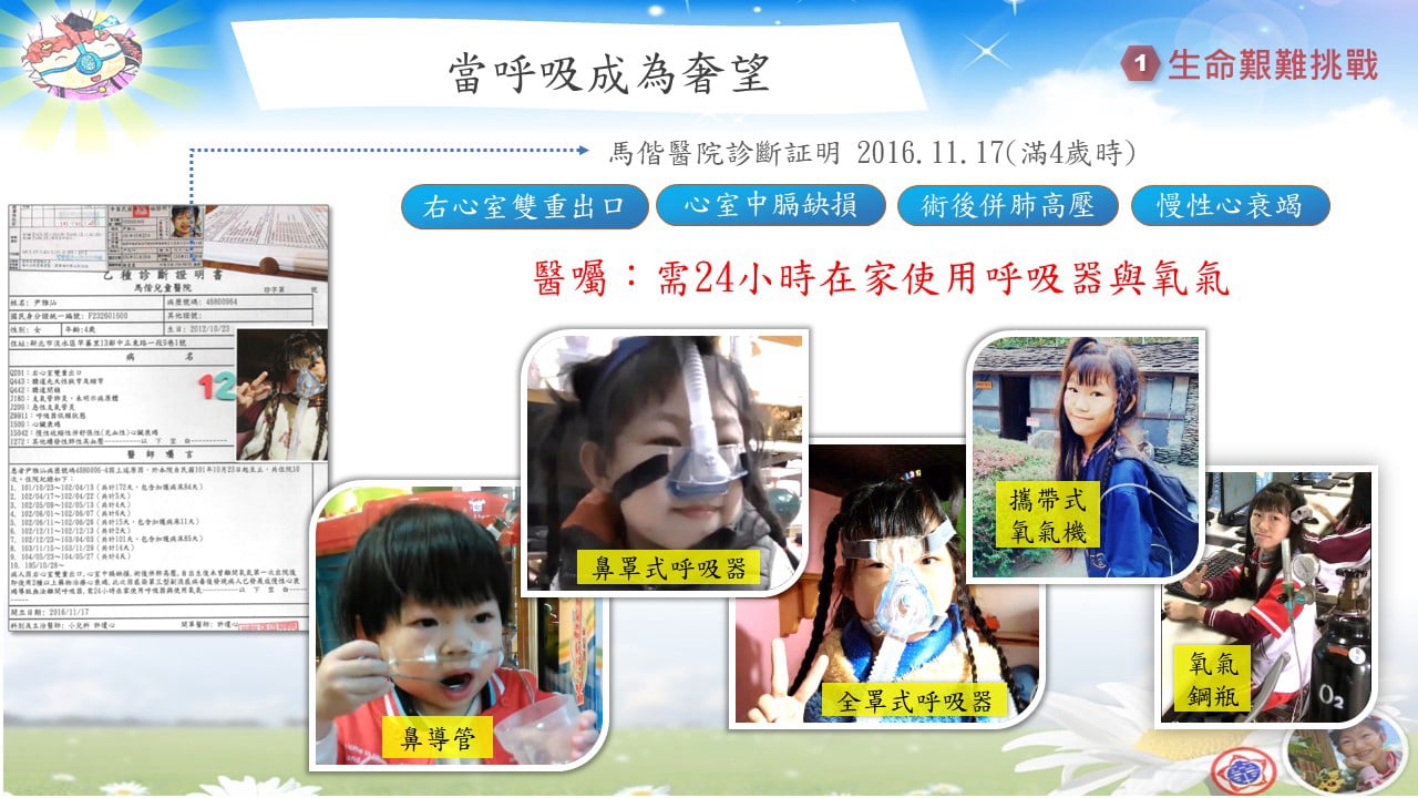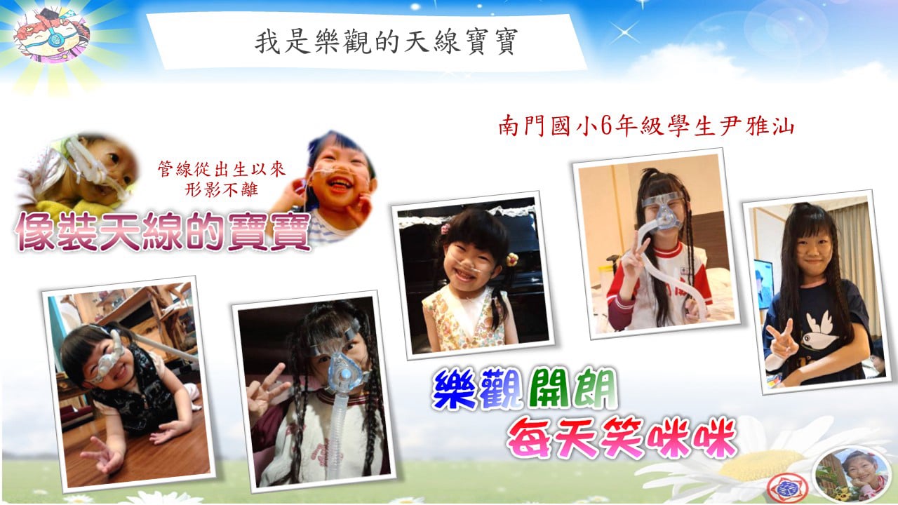 我是雅汕,我的出生是一個奇蹟。剛來到這個世界時,醫生曾說我可能只能活到四歲。因此生命最初的幾年,我幾乎每天都靠著營養針維生,馬偕醫院的嬰兒加護病房成了我第二個家。那段日子,氧氣機與氧氣管形影不離,我像是一個裝了天線的寶寶,父母也因為我的病況,幾度淚眼難眠。