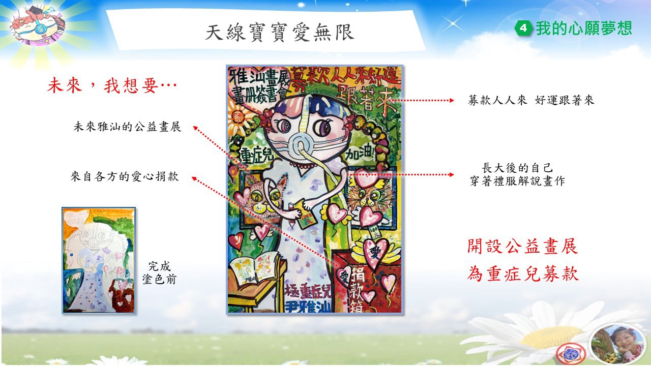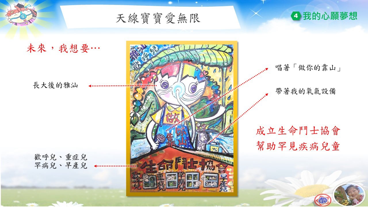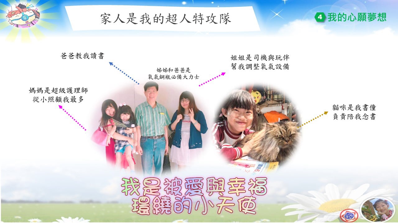 在幼年時,我深深體會到「呼吸」其實不是理所當然的事,我特別珍惜每一次表達自己、關懷他人的機會。因此我特別希望,未來能用自己的經歷幫助更多需要幫助的人。