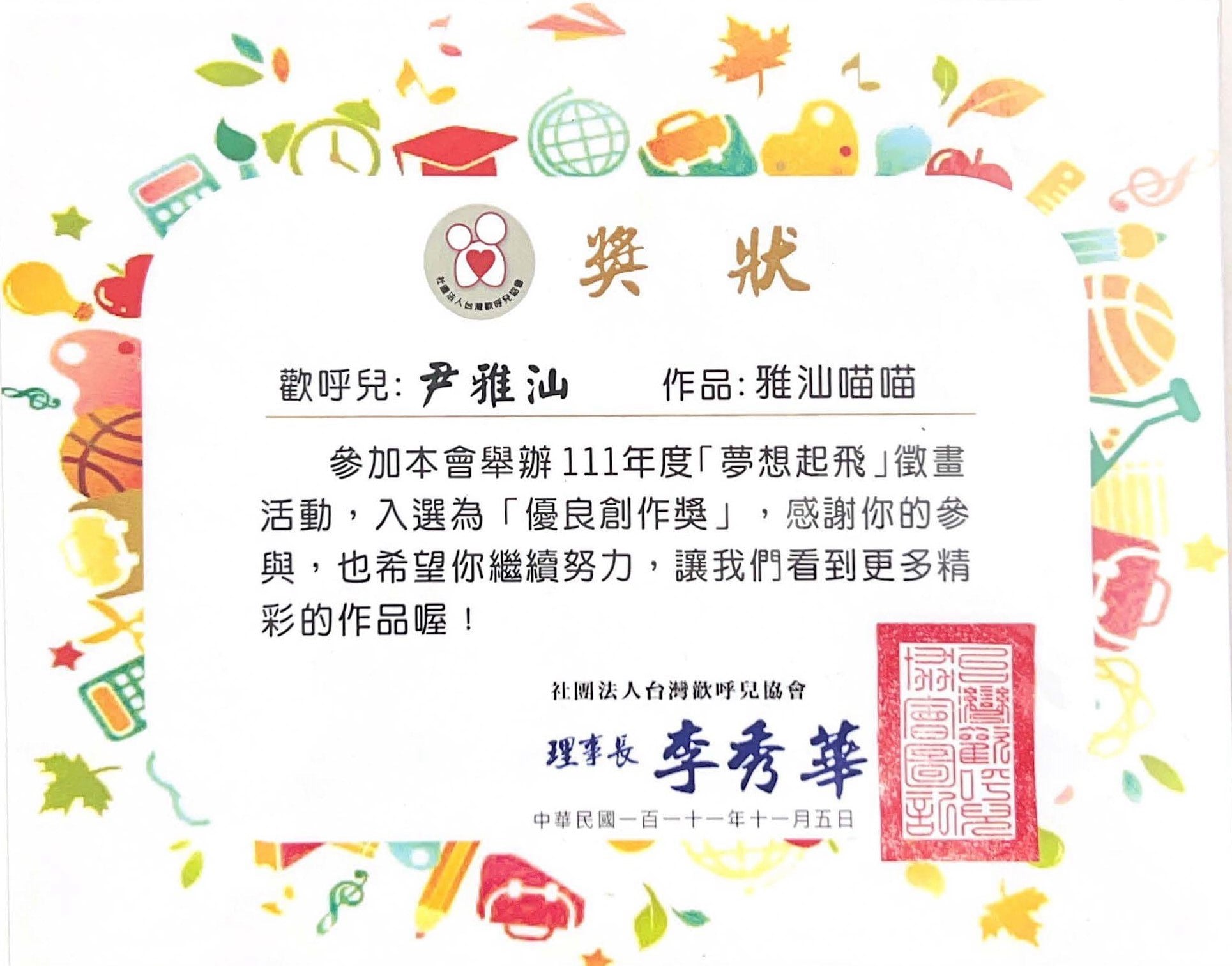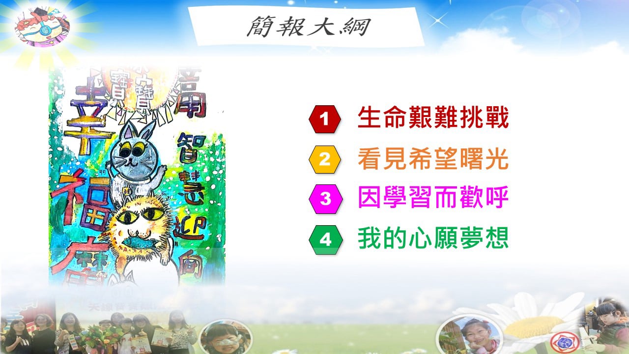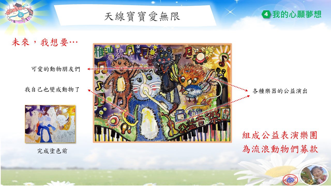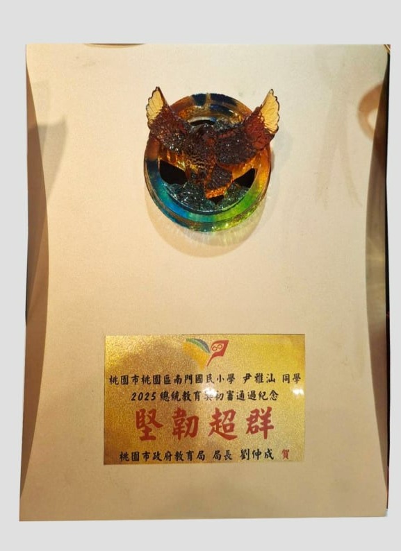 但我沒有放棄。努力活下來的我,現在已經順利從國小畢業。我在音樂與美術中找到熱情與力量,也很感謝學校給我參與比賽的機會,感謝評審對我作品的肯定。尤其在獲得2025年總統教育獎之後,我更有勇氣堅持夢想、走出屬於自己的一條路。