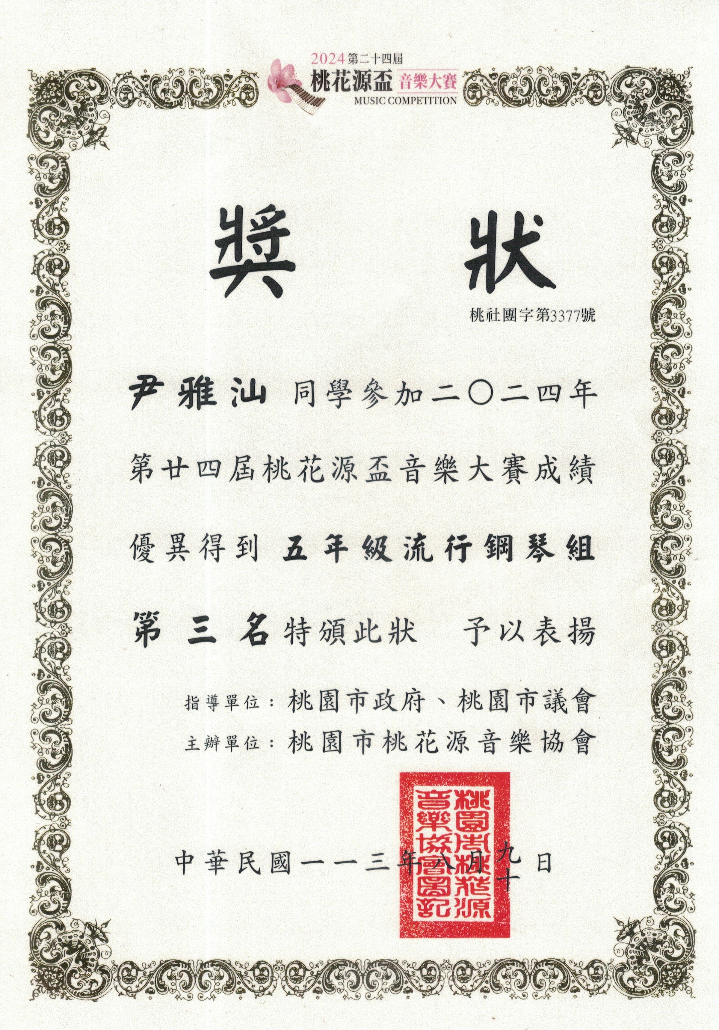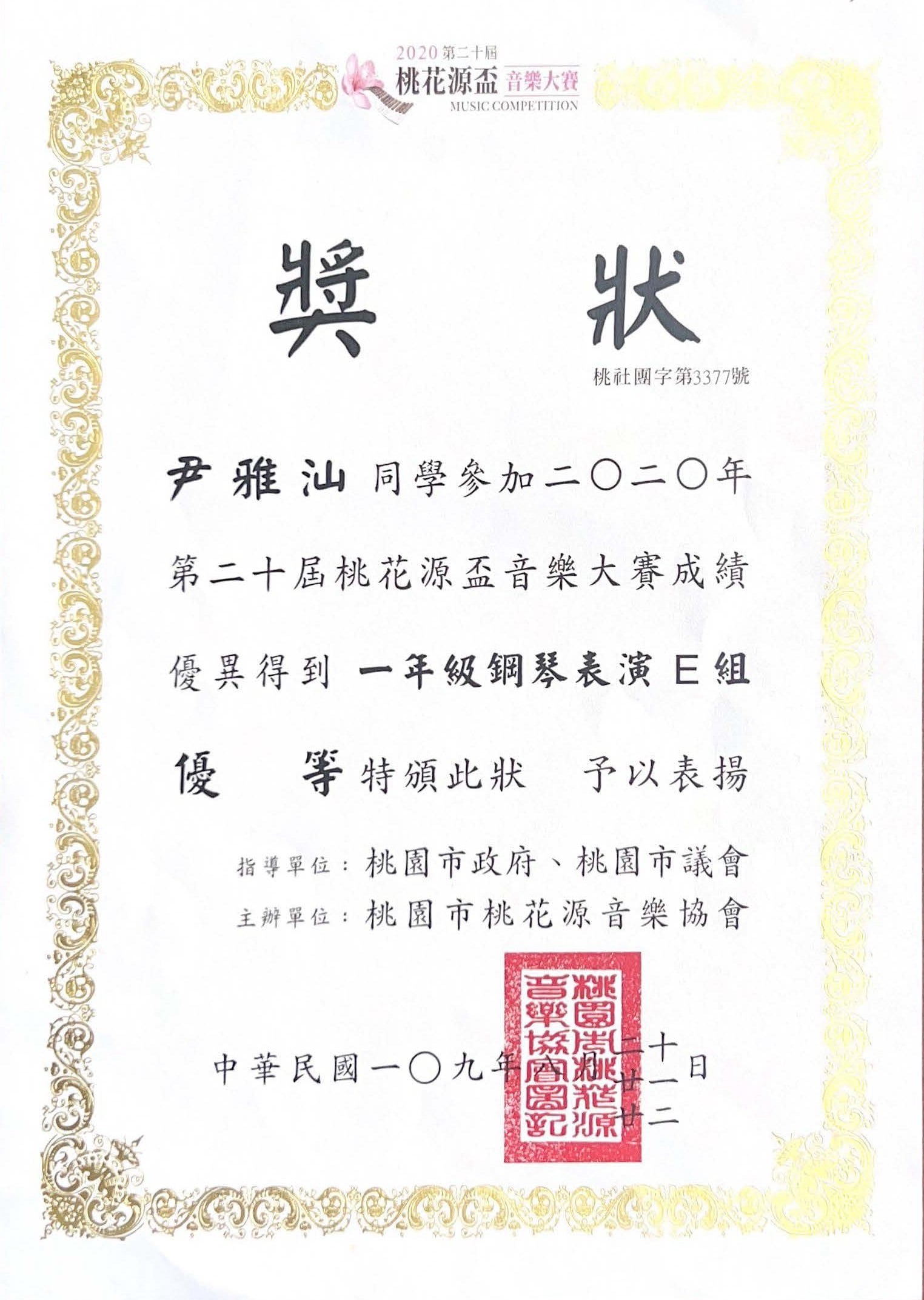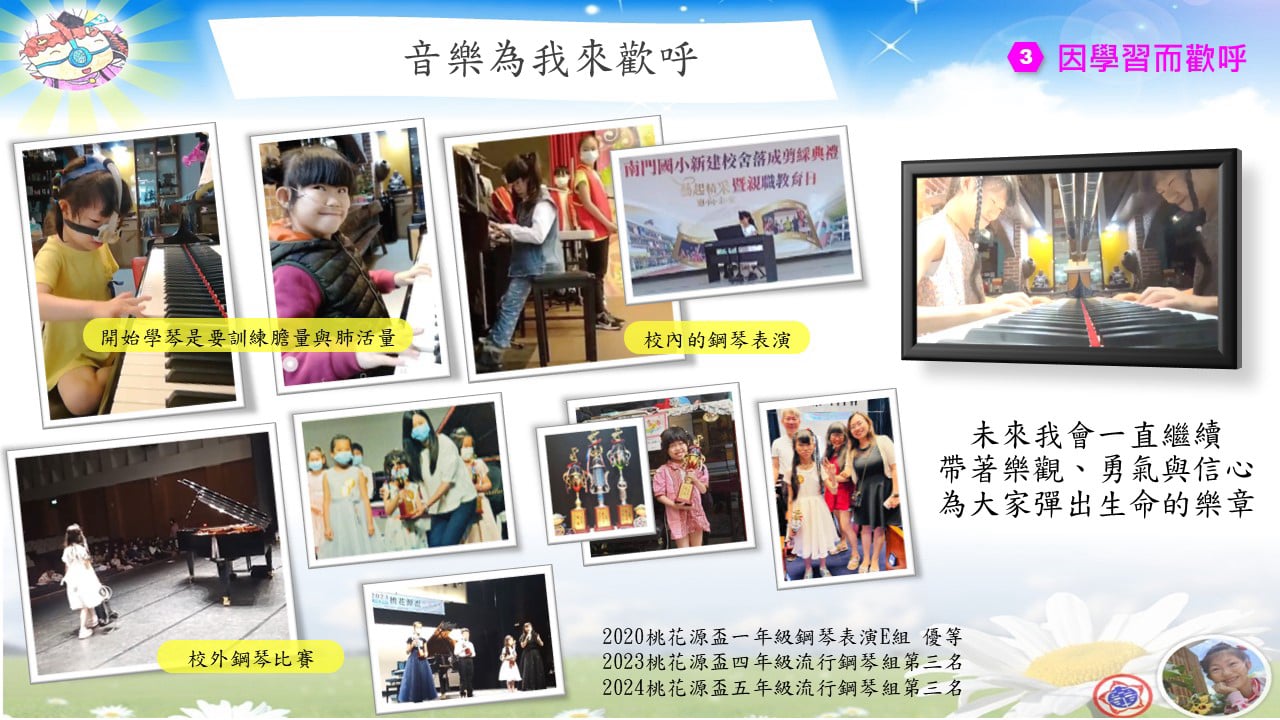 開始學鋼琴,從琴鍵開始築夢,雅汕用雙手彈奏出努力與堅持的樂章,低年級獲得桃花源鋼琴比賽優等,中高年級連續兩年榮獲第三名