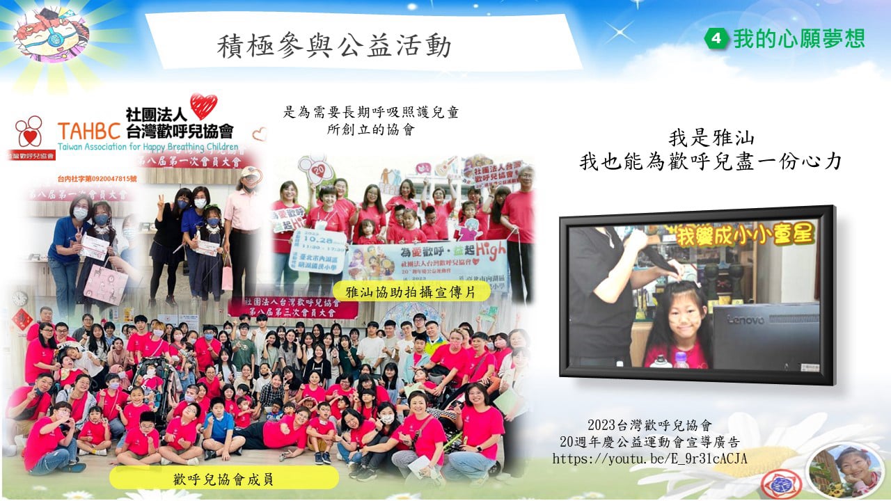 在幼年時,我深深體會到「呼吸」其實不是理所當然的事,我特別珍惜每一次表達自己、關懷他人的機會。因此我特別希望,未來能用自己的經歷幫助更多需要幫助的人。