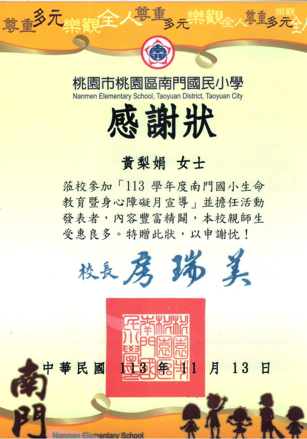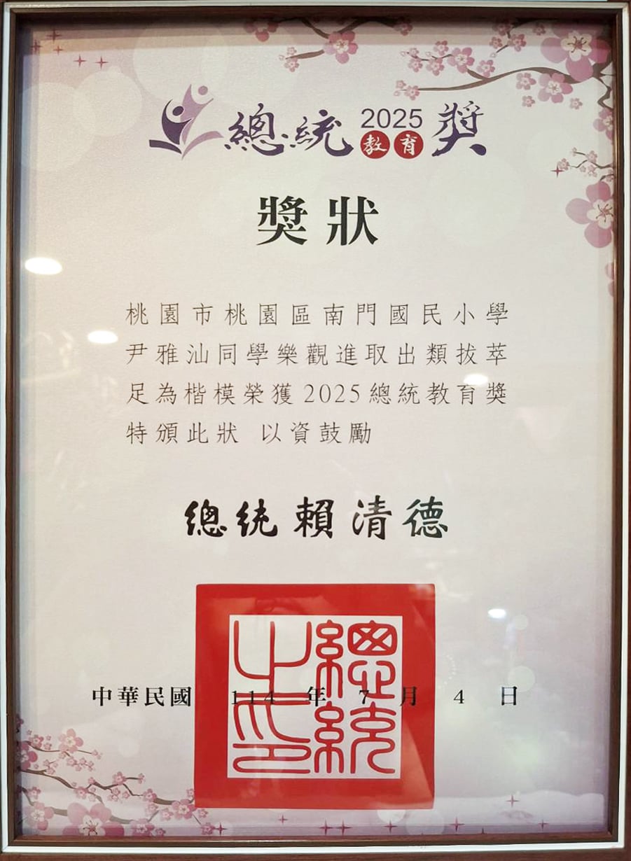 7月時榮獲總統教育獎國小組,受邀至桃園市府與總統府頒獎